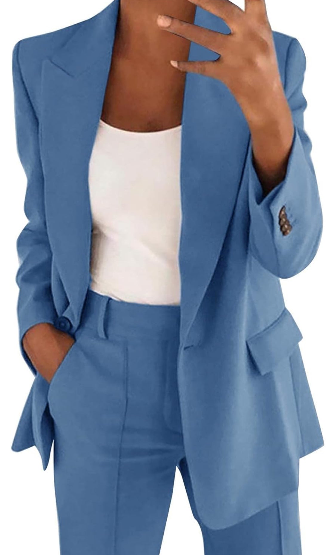 Et velsiddende jakke- og buksesæt udstråler klassisk elegance og raffinement. Perfekt til kvinder, der sætter pris på ubesværet sofistikering, dette sæt kombinerer et smart design med et skræddersyet snit til at løfte enhver lejlighed. Uanset om du deltager i en formel begivenhed eller nyder en afslappet dag ude, tilføjer dette sæt et raffineret touch til dit look.